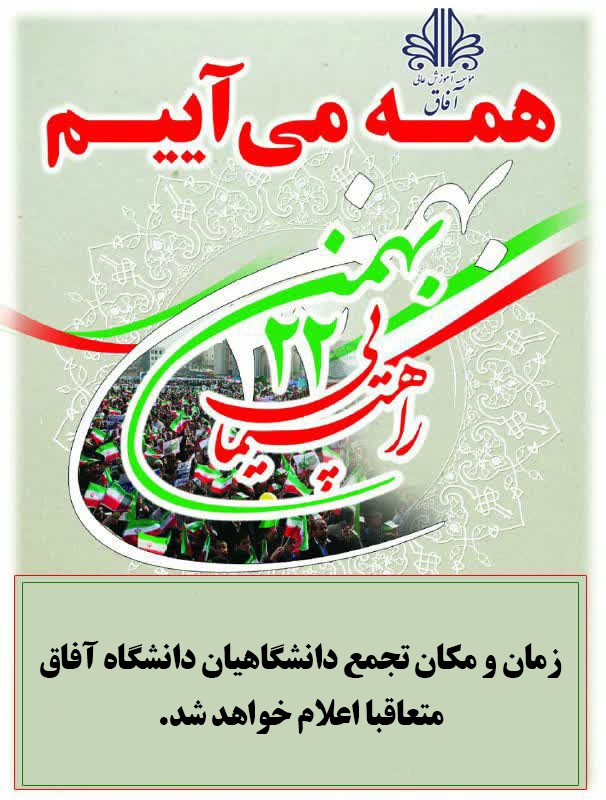 اینجانب به‌عنوان رئیس هیات موسس دانشگاه، از تمامی اساتید، کارکنان و دانشجویان گران‌قدر دعوت می‌کنم تا با حضور پرشور، مسئولانه و باشکوه در راهپیمایی یوم‌الله ۲۲ بهمن، ضمن تجدید میثاق با آرمان‌های امام راحل (ره) و شهدای گران‌قدر، بار دیگر بر استقلال، عزت و اقتدار ایران اسلامی تأکید ورزند.